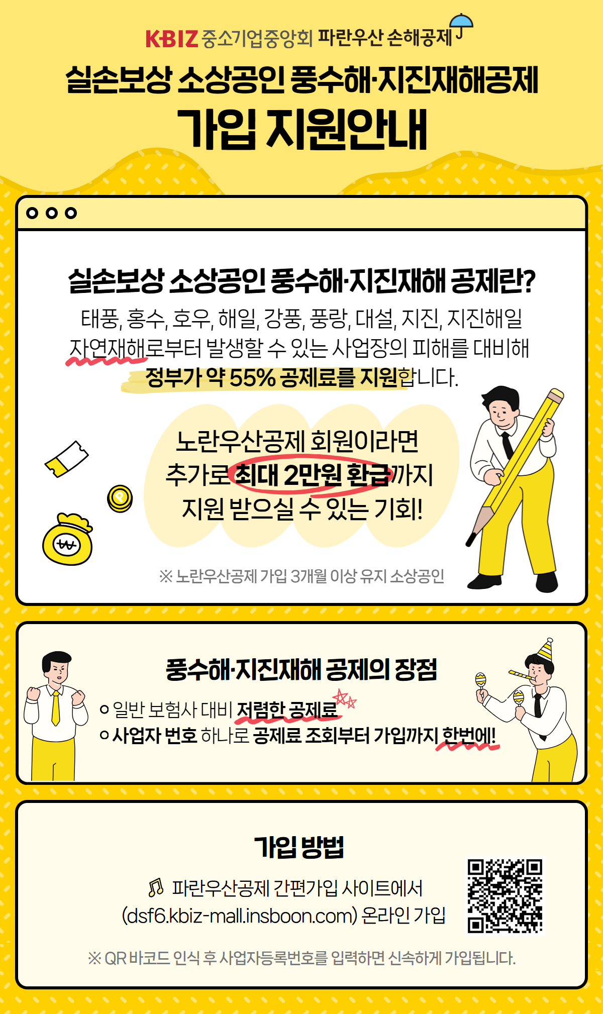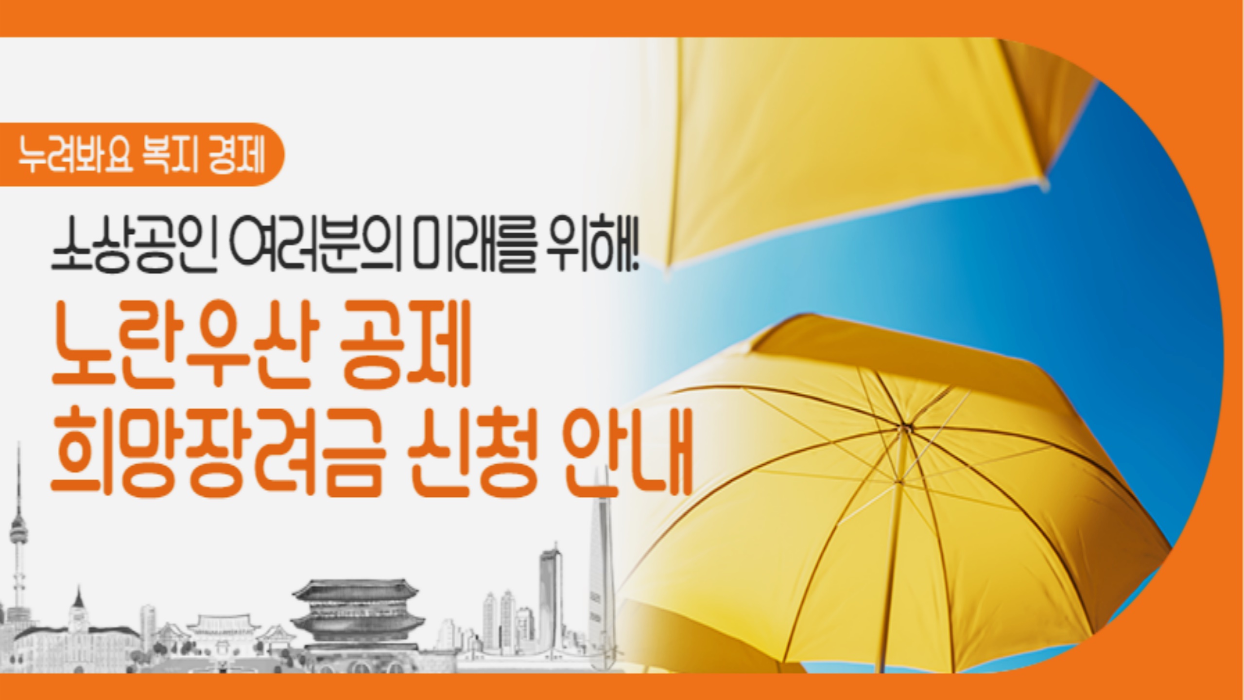 정부와 지자체가 소상공인들의 사회안전망 확대를 위해 노란 우산 신규가입 장려금을 팍팍 지원해주고 있거든요.
