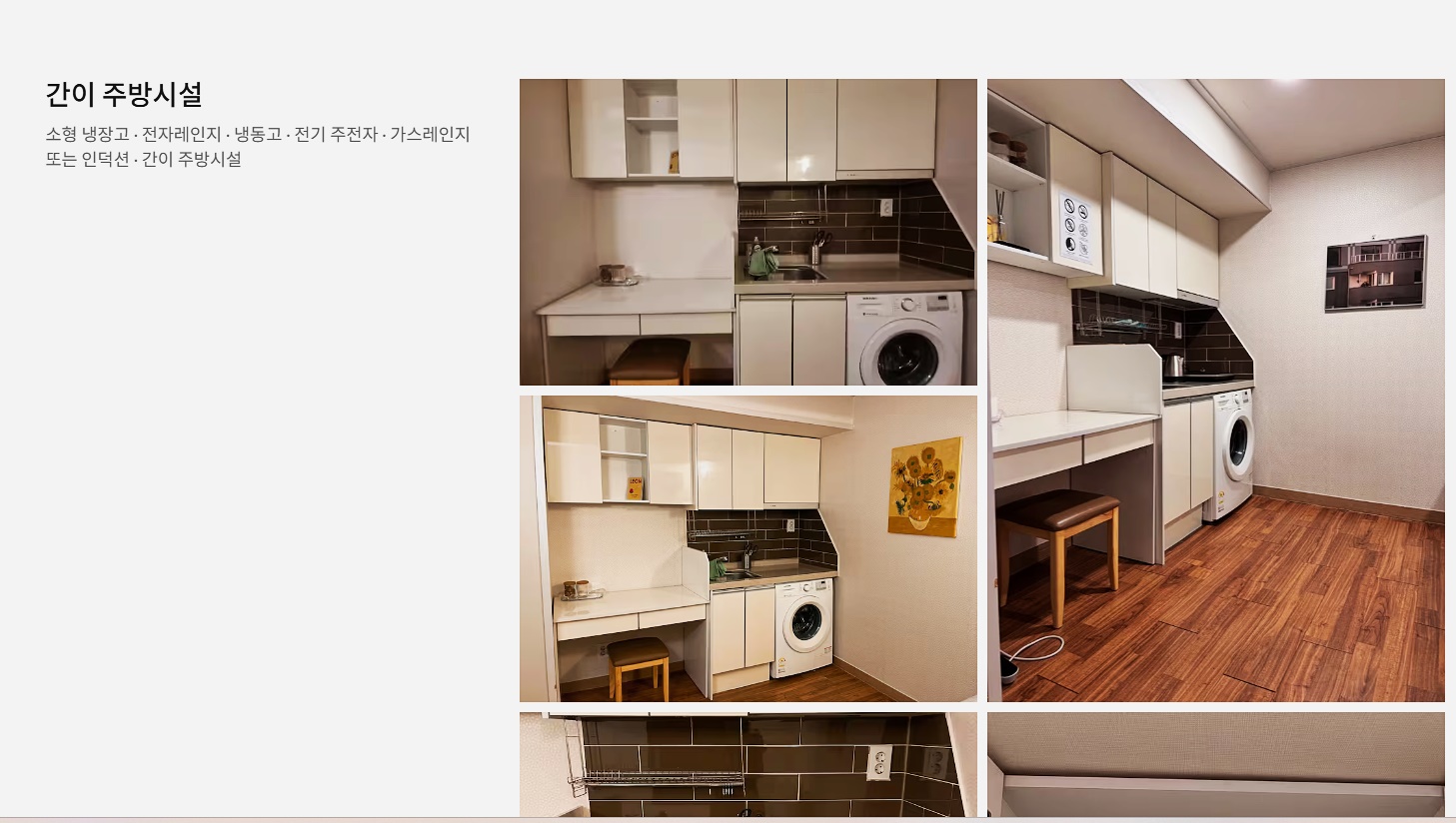 주방 시설이 갖춰져 있어서 직접 요리도 할 수 있고, 세탁기도 있어서 빨래 걱정도 없으니