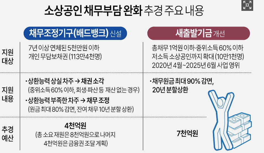 새 출발기금 외에 소상공인 채무부 담을 완화하기 위해 배드뱅크도 신설